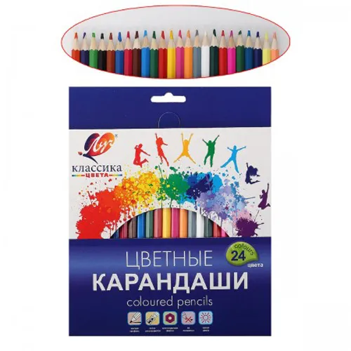 Цветные карандаши "Классика цвета" торговой марки ЛУЧ. В наборе 24 разноцветных карандаша в картонной коробке с ярким привлекательным дизайном. Предназначены для рисования и творческой деятельности, как в школе, так и дома для всех возрастов. Изготовлены из качественной натуральной древесины липы. Корпус классического шестигранного сечения. Ударопрочный экстрамягкий грифель, благодаря качественной проклейке, не ломается при заточке карандаша, а также при его падении. Цвета яркие и насыщенные, хорошо смешиваются. Рисунок ложится на бумагу густо, сплошной чёткой линией. Цвет покрытия корпуса соответсвует цвету грифеля.