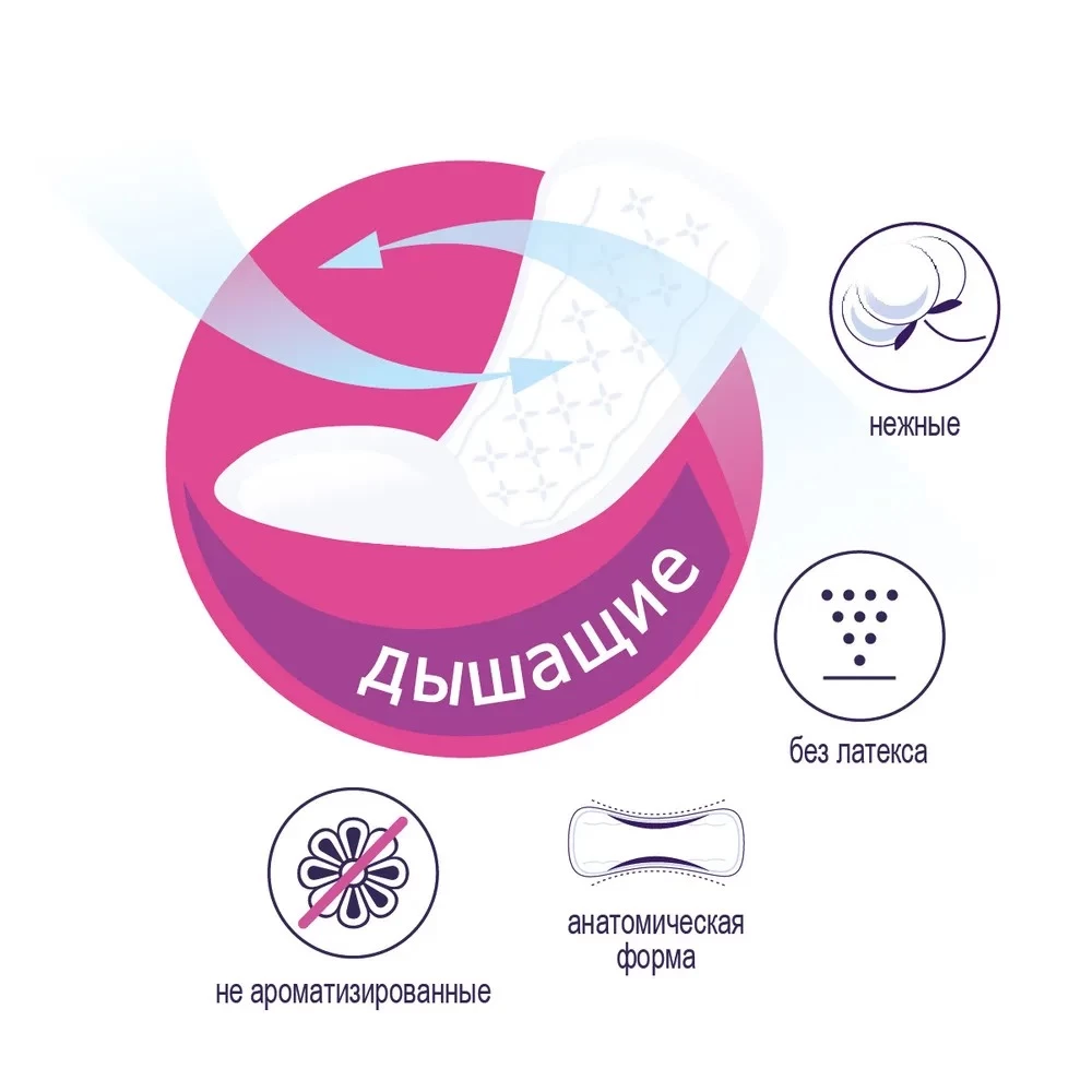 Дышащая ежедневная прокладка традиционной толщины, анатомической формы, обеспечит ощущение свежести в течение всего дня. Верхний слой ежедневки покрыт тонким и мягким нетканым материалом.