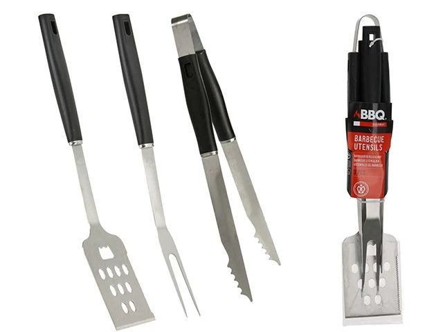 Набор инструментов для гриля включает в себя три необходимых предмета: лопатку, вилку и щипцы, которые помогут вам с легкостью справиться с приготовлением блюд на гриле.