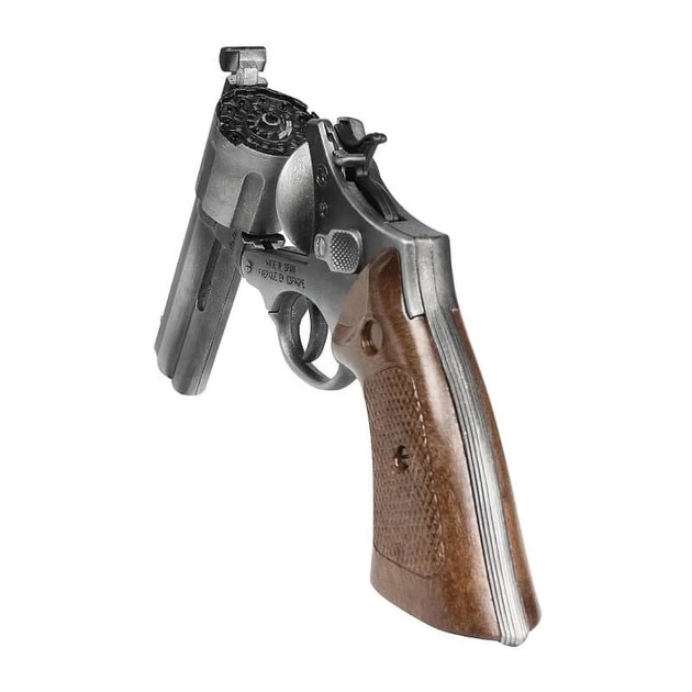 Корпус, ствол, барабанный магазин, сердечник рукоятки и литье изготовлены из металла.