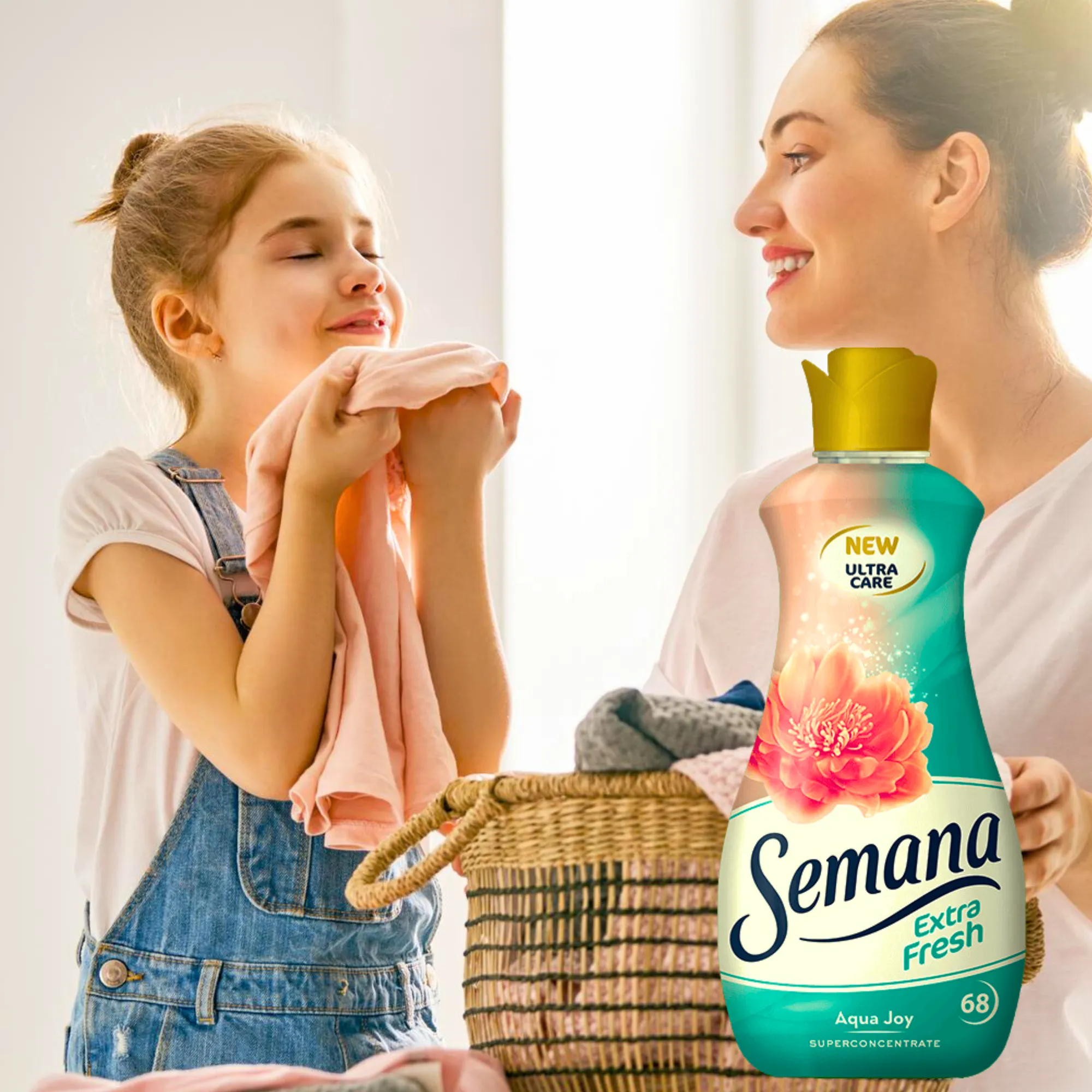 Для достижения превосходных результатов Semana уделяет особое внимание качеству, используя лучшие ингредиенты, новейшие технологии и ароматы, разработанные ведущими мировыми парфюмерными домами. Теперь его суперконцентрированная формула обеспечивает длительный эффект при использовании небольшой дозы кондиционера, поэтому одного флакона кондиционера Semana достаточно для стирки нескольких вещей.