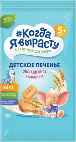 еченье детское Когда Я вырасту - это сбалансированный и полезный детский продукт питания или дополнительного прикорма для детей старше 6 месяцев.Разнообразные форматы печенья от мини-мини, которые так удобно держать маленькими детскими ручками, до стандартных, с забавными надписями на каждом из них, превратят процесс питания в развлечение!
