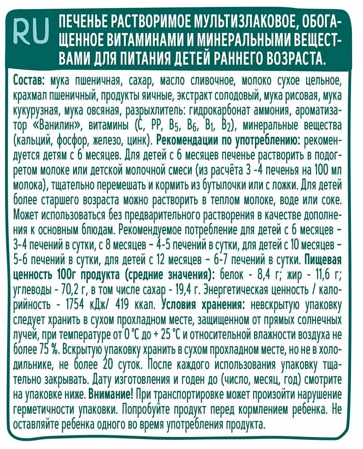Состав: Мука пшеничная, сахар, масло сливочное, молоко сухое цельное, крахмал пшеничный, меланж яичный, экстракт солодовый, мука рисовая, мука кукурузная, мука овсяная, разрыхлитель: гидрокарбонат аммония, ароматизатор “Ванилин”, витамины (С, РР, В5, В6, В1, В2), минеральные вещества (кальций, фосфор, железо, цинк).