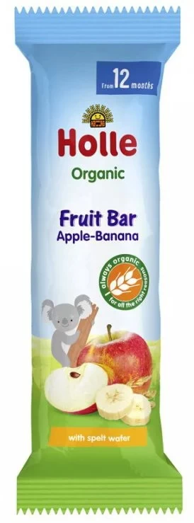 Holle Organic Fruit Bar Apple Banana. Этот фруктовый батончик содержит концентрат яблочного сока, сушеные бананы и овсяные хлопья, а также другие ингредиенты. Благодаря удобному и практичному размеру его легко схватить даже маленьким ручкам. Фруктовый батончик имеет вафельную основу из цельнозерновой муки спельты и подходит для детей с 12 месяцев.