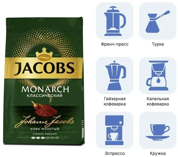 Для создания Jacobs Monarch Молотый используются отборные зерна арабики и робусты из Латинской Америки и Азии. Благородная обжарка раскрывает насыщенный вкус и восхитительные нотки кофейного букета. Насладитесь идеальным утром или обеденным перерывом с чашкой кофе из кофеварки!