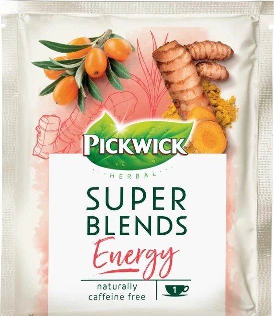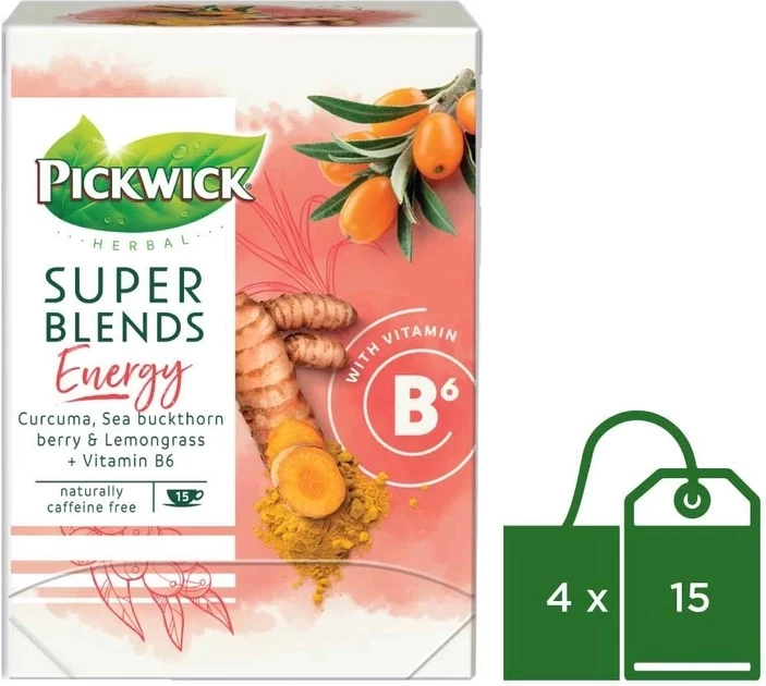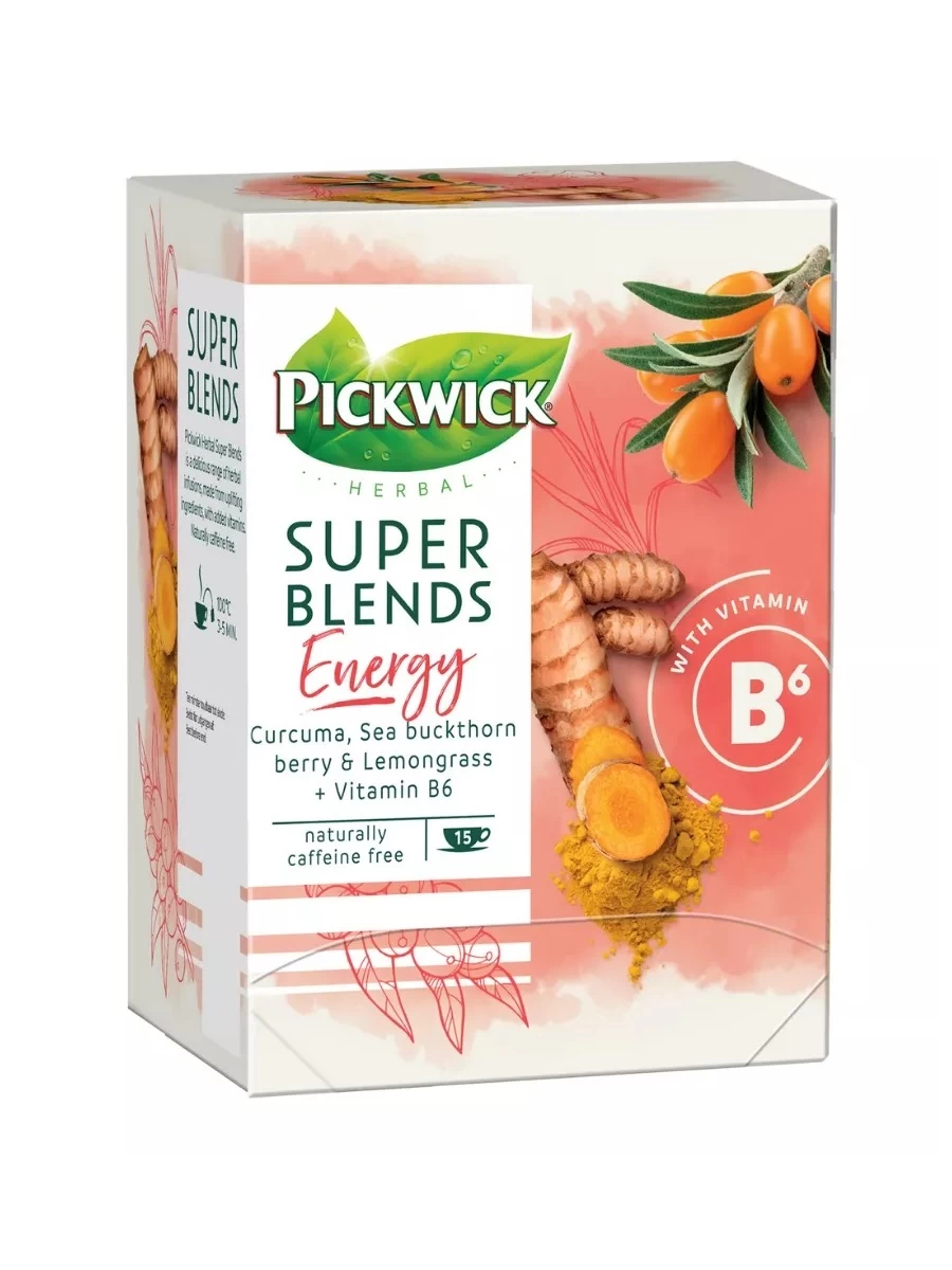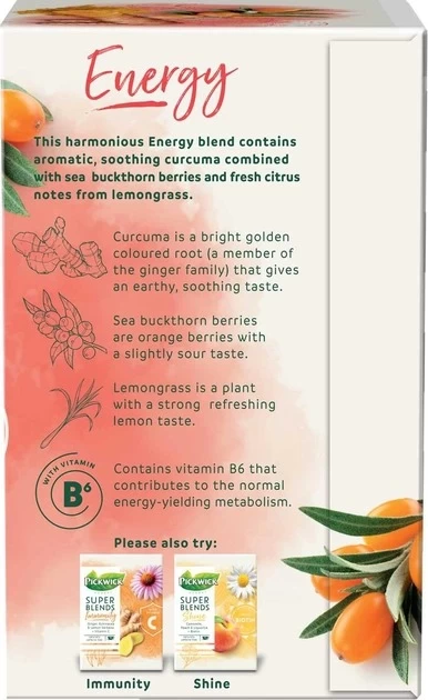 Травяной чай Pickwick Super Blends Energy – это смесь куркумы в сочетании с ягодами облепихи и свежими нотами лимонной травы. Чай обогащен витамином B6, чтобы поддержать ваш уровень энергии.