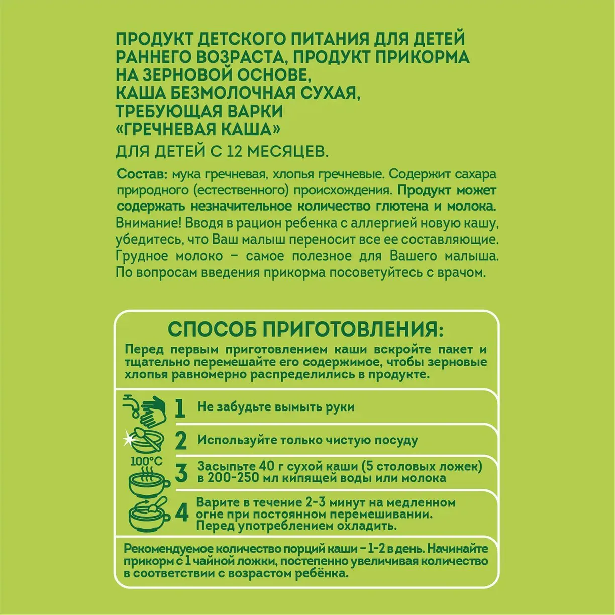 Гречневые каши для варки не нагружают желудочно-кишечный тракт, но при этом полноценно насыщают детский организм энергией и питательными веществами. Злаковые культуры в составе каш обрабатываются паром, что позволяет сохранить их полезные свойства. Варить продукт необходимо 2-3 минуты.