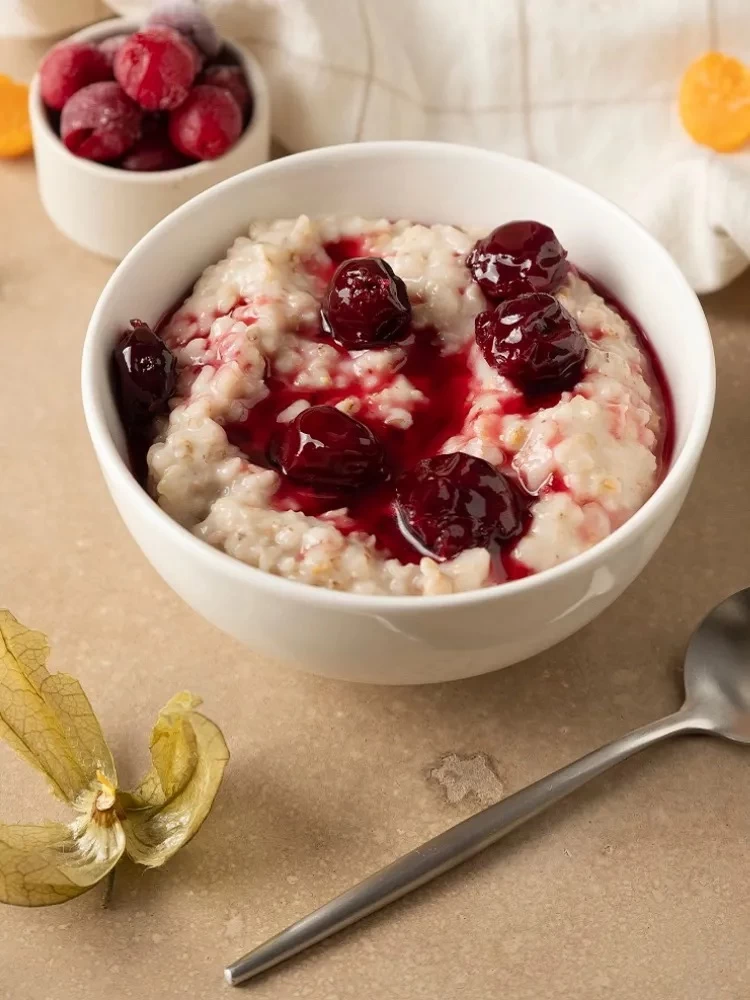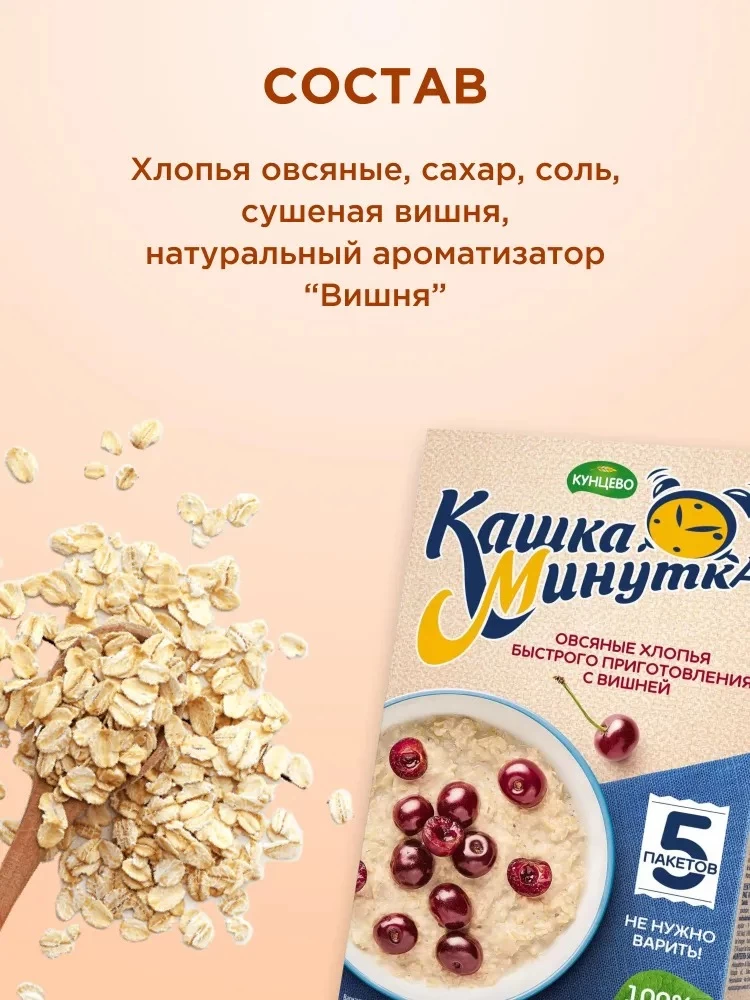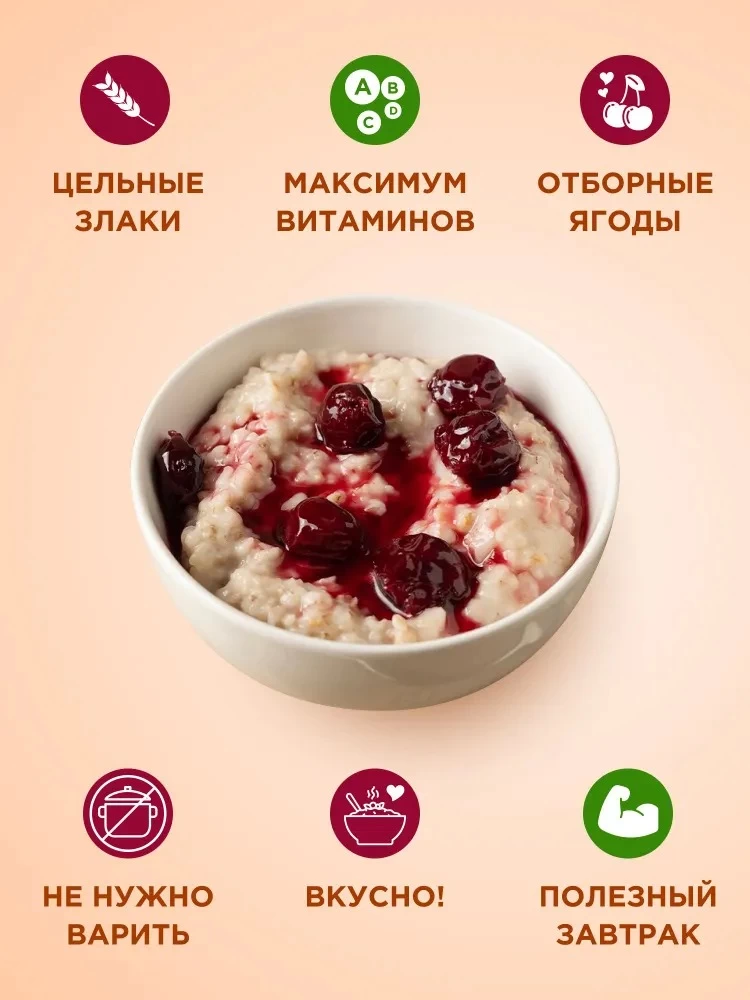 Состав: хлопья овсяные, сахар, кусочки сушеных вишни, соль, заменить сухих сливок (сухая молочная сыворотка, рафинированное кокосовое масло), ароматизатор Вишня.