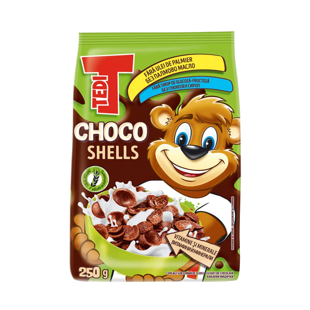 Хлопья Tedi в форме ракушек со вкусом шоколада, из цельнозерновых злаков, без пальмового масла и сиропа глюкозы-фруктозы.