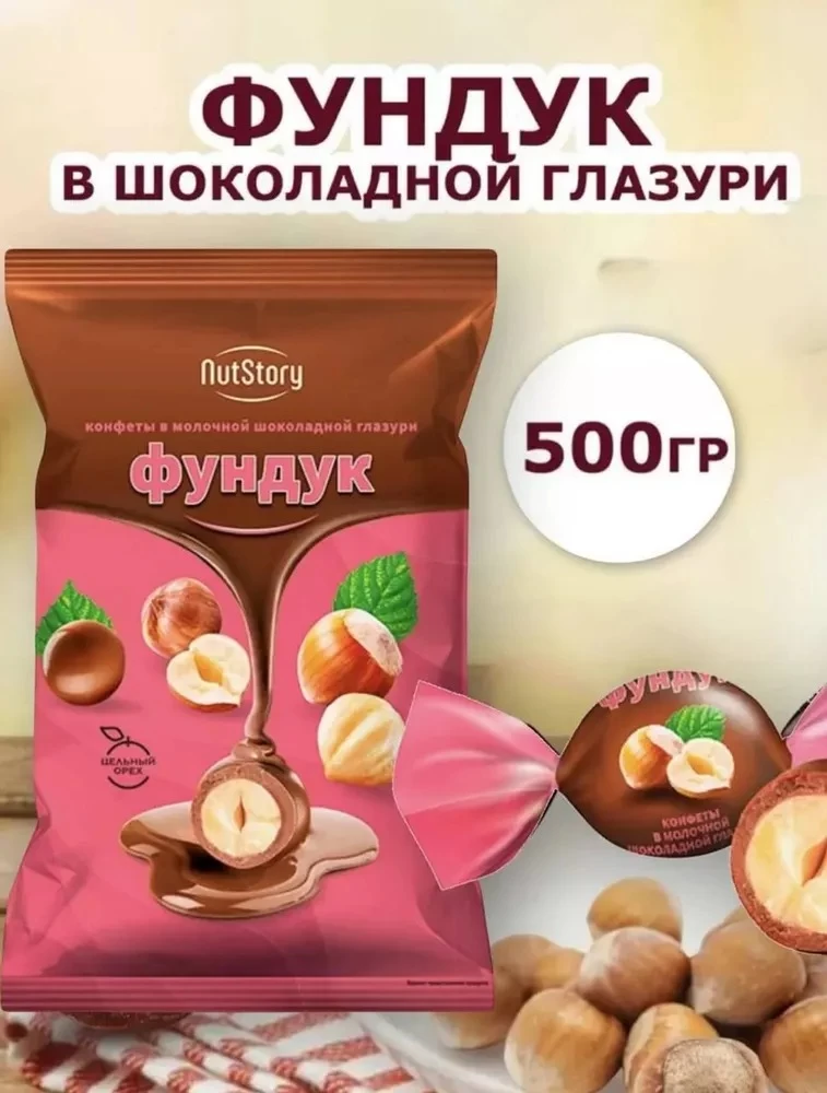Конфета из цельного жареного фундука в глазури из молочного шоколада.