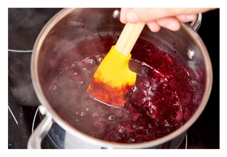 - Когда закипит, снимите кастрюлю с огня, добавьте остальной сахар и снова доведите до кипения; кипятите ровно одну минуту, постоянно помешивая, затем снимите с огня;