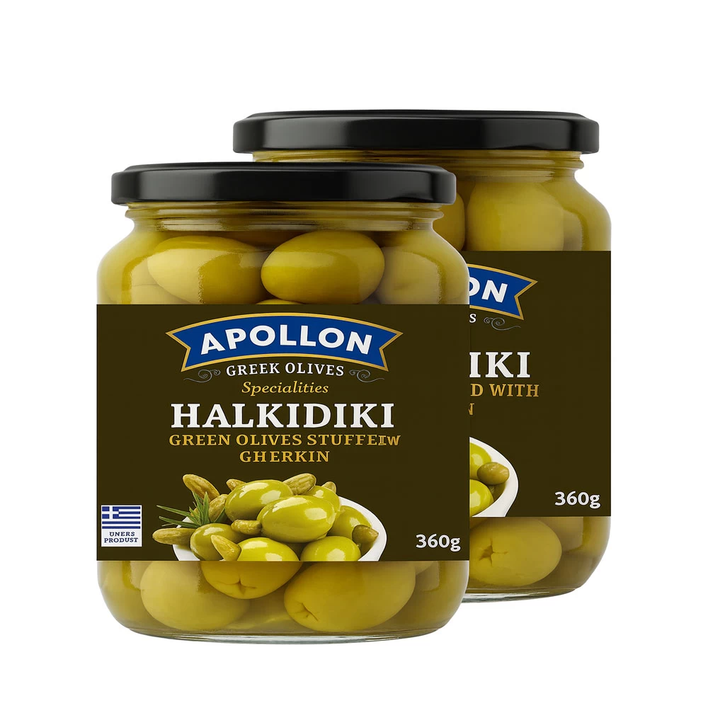 Apollon – Оливки Халкидики с начинкой из корнишона, банка 360 г