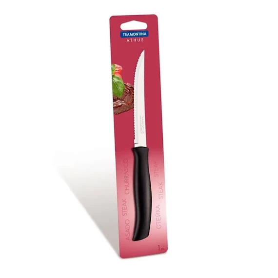 Нож для стейка Tramontina Athus с лезвием 12,5 см изготовлен из нержавеющей стали AISI 420, не теряющей блеска, обладающей высокой пластичностью, долго сохраняющей остроту, устойчивой к коррозии и высоким температурам. Клинок украшен гравировкой логотипа Tramontina. Нескользящая эргономичная рукоять из полипропилена с антибактериальным покрытием приятна на ощупь. Нож легкий и удобно ложится в руку. Идеально подходит для повседневного использования как в быту, так и на профессиональных кухнях, в барах, ресторанах. Нож Tramontina Athus можно мыть в посудомоечной машине.
