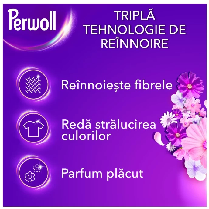 Откройте для себя жидкое моющее средство Perwoll Blossom с технологией triple renew - идеальный уход за цветным бельем! Это жидкое моющее средство не только обеспечивает бережную очистку одежды, но и наилучшим образом ухаживает за ее цветом и волокнами: удаляет тусклость, образовавшуюся на поверхности одежды в процессе носки, и превращает цвета из тусклых в яркие.