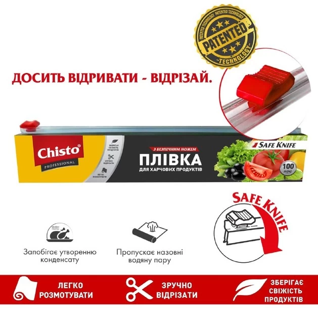 Пленка Chisto оснащенна безопасным ножом, данная технология запатентована Chisto.