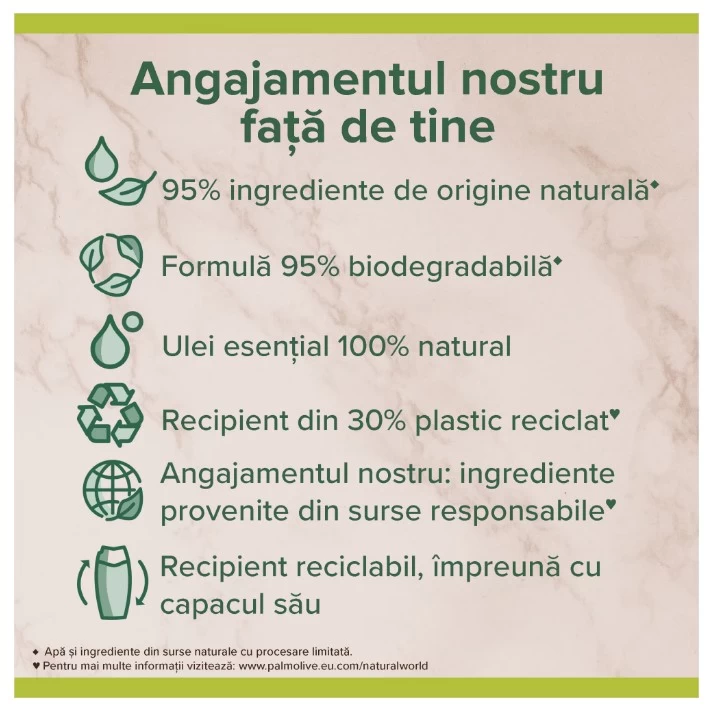 Продукт изготовлен на 93% из натуральных ингредиентов*, имеет 95% биоразлагаемую формулу без микропластика и содержит 100% натуральные эфирные масла, экстракт алоэ и морские соли.