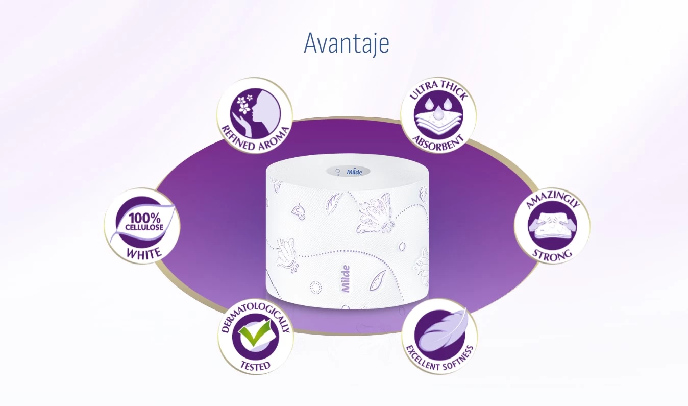 Milde - это 3-слойная 100% чистоцеллюлозная туалетная ткань премиум-класса.