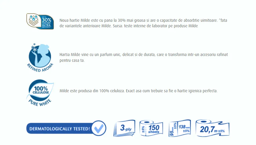 Milde - это 3-слойная 100% чистоцеллюлозная туалетная ткань премиум-класса. Бумага имеет четко выраженную перфорацию, дерматологически протестирована и имеет длину 21 м. Он имеет уникальный дизайн с художественными цветочными узорами и узорами бабочек, запечатленных в полете. Она мягкая на ощупь, прочная и обладает высокой впитывающей способностью. Интенсивный аромат магнолии создает спокойную и расслабляющую атмосферу.