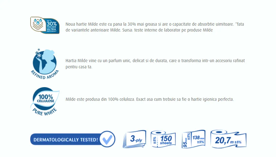 Milde - это 3-слойная 100% чистоцеллюлозная туалетная ткань премиум-класса.