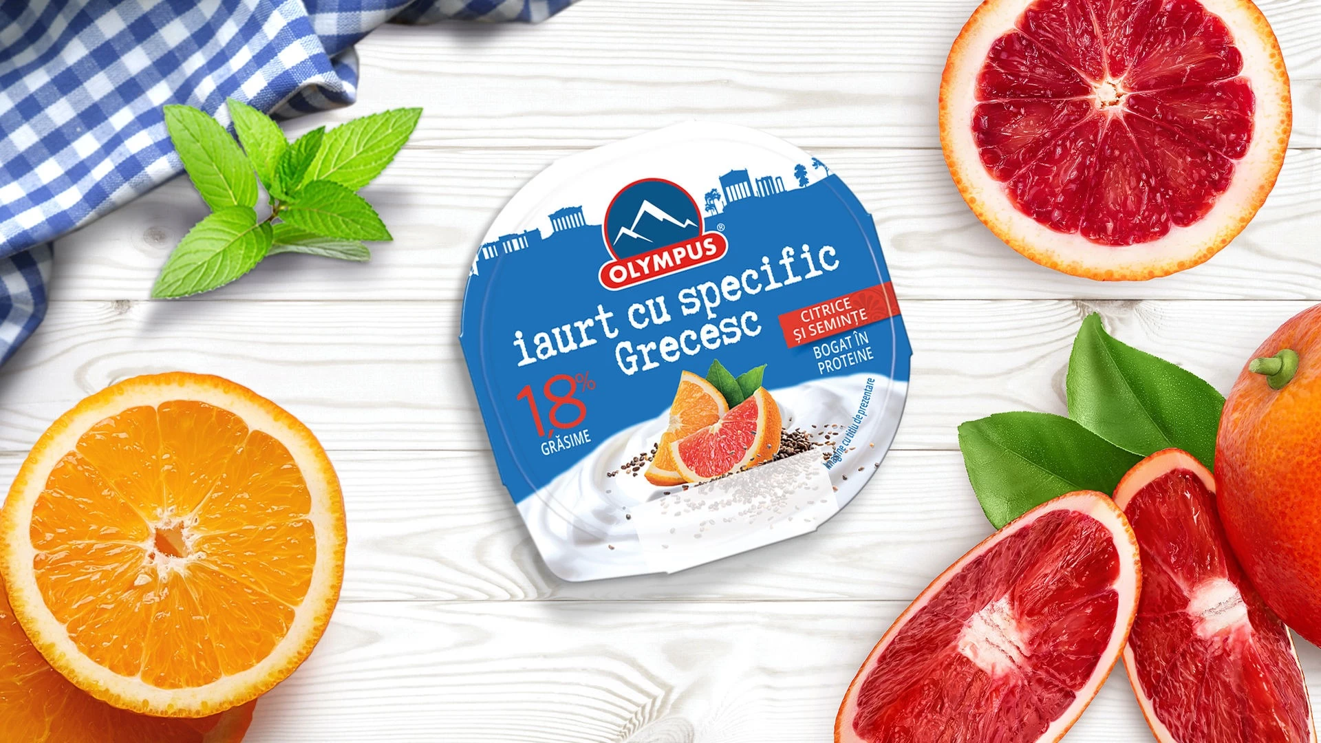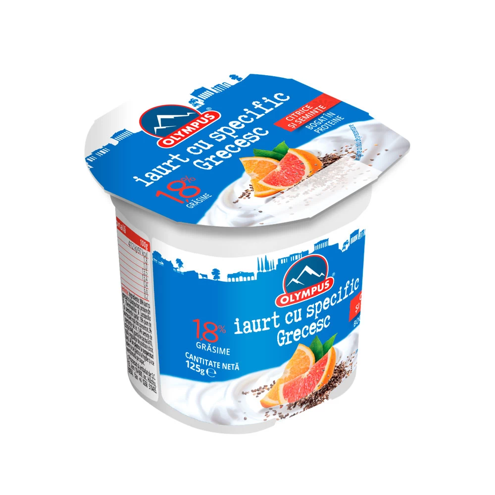 80% греческий йогурт (полуобезжиренное и пастеризованное коровье молоко, молочные белки, молочные культуры: S. Thermophilus, L. Bulgaricus); 20% Цитрусовая и семечковая подготовка (сахар, 15% апельсинового пюре из концентрата, 10% сока красного апельсина из концентрата, 5% лимонного пюре из концентрата, 1,4% семян льна, 1,4% семян чиа (Salvia hispanica), стабилизаторы (пектин E440, камедь рожкового дерева E410), концентрат морковного сока, натуральный ароматизатор, регулятор кислотности (цитрат натрия E331), концентрат лимонного сока).