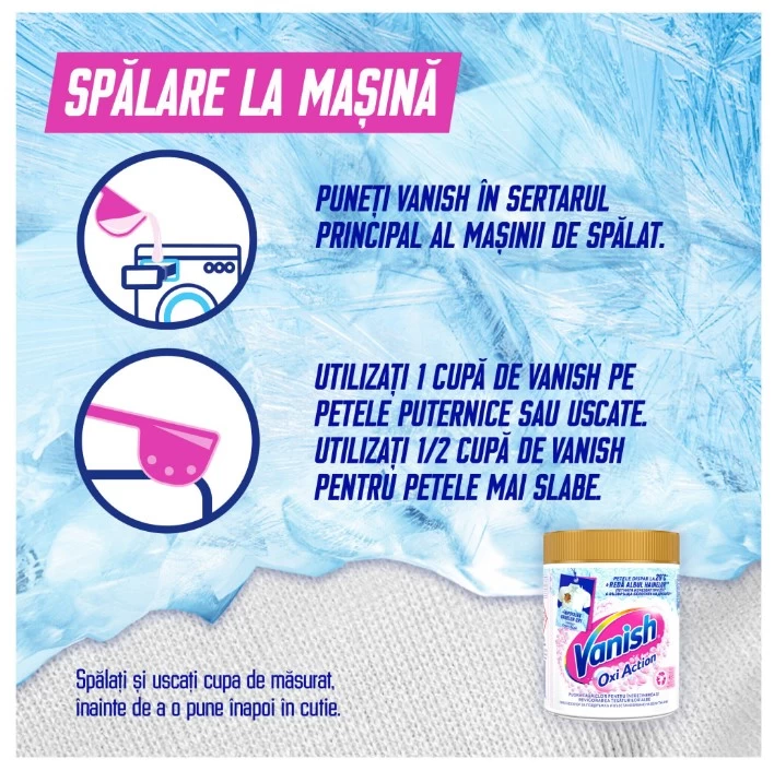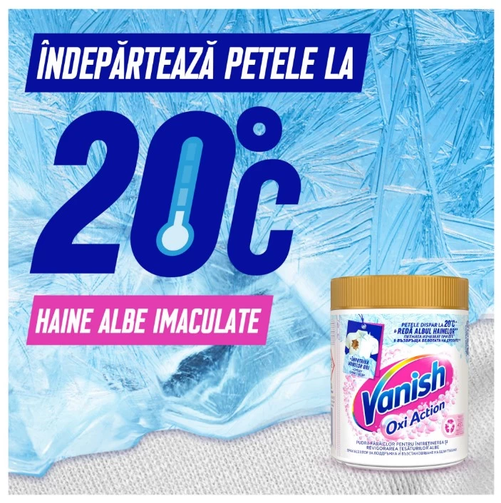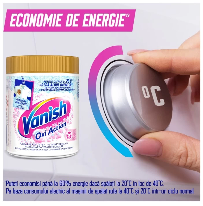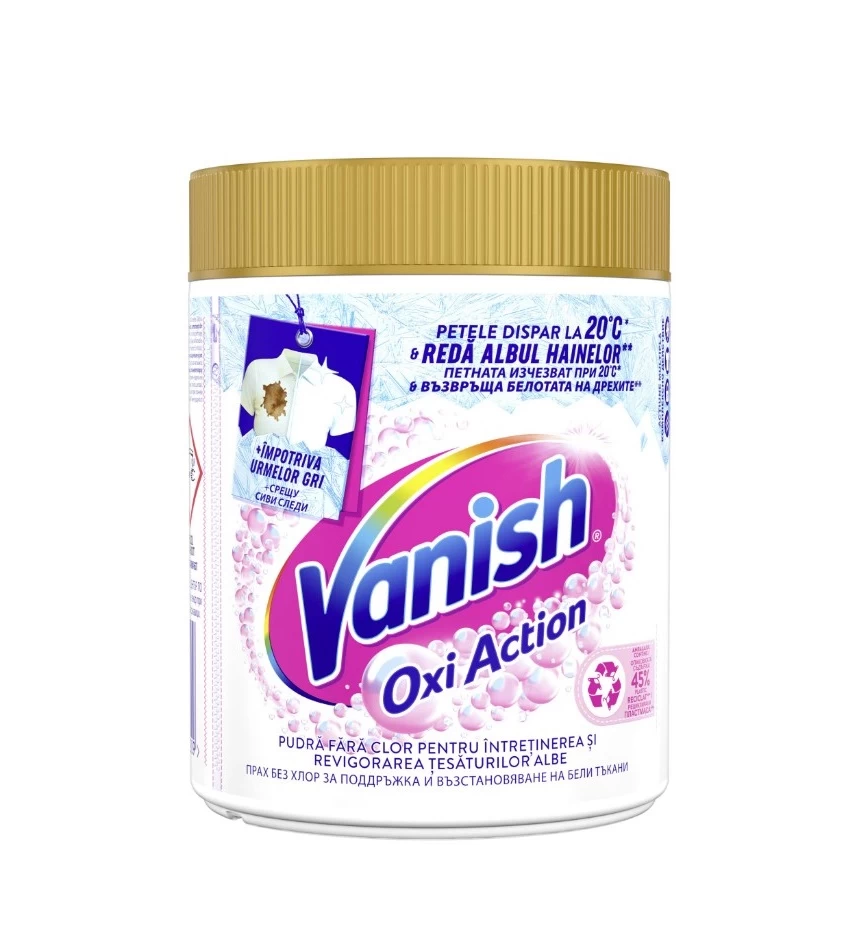 Освежающий порошок для ухода за белыми тканями Vanish действует на все типы пятен, от тех, которые вы можете легко увидеть, до мелких пятен, которые вы не замечаете до стирки - даже на самые трудные жирные пятна.