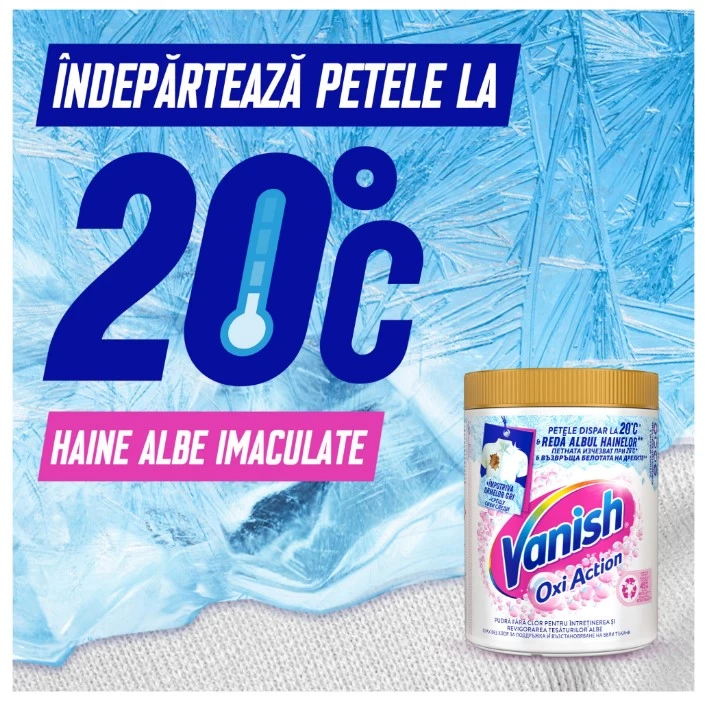 Vanish White отбеливает белое белье с каждой стиркой, до 3 оттенков белее, чем почерневшее (результаты могут отличаться).