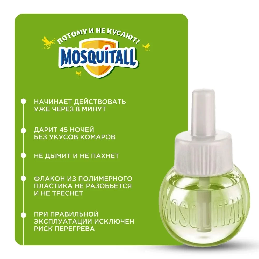 Средство инсектицидное, жидкость от комаров москитолл в комплекте к электро фумигатору, рассчитана на работу в течение 45 ночей по 8 часов, в помещениях с хорошей вентиляцией, в закрытых помещениях репеллент следует включать не более 1 часа в день. При установке следите, чтобы флакон с репеллентным средством располагался вертикально.