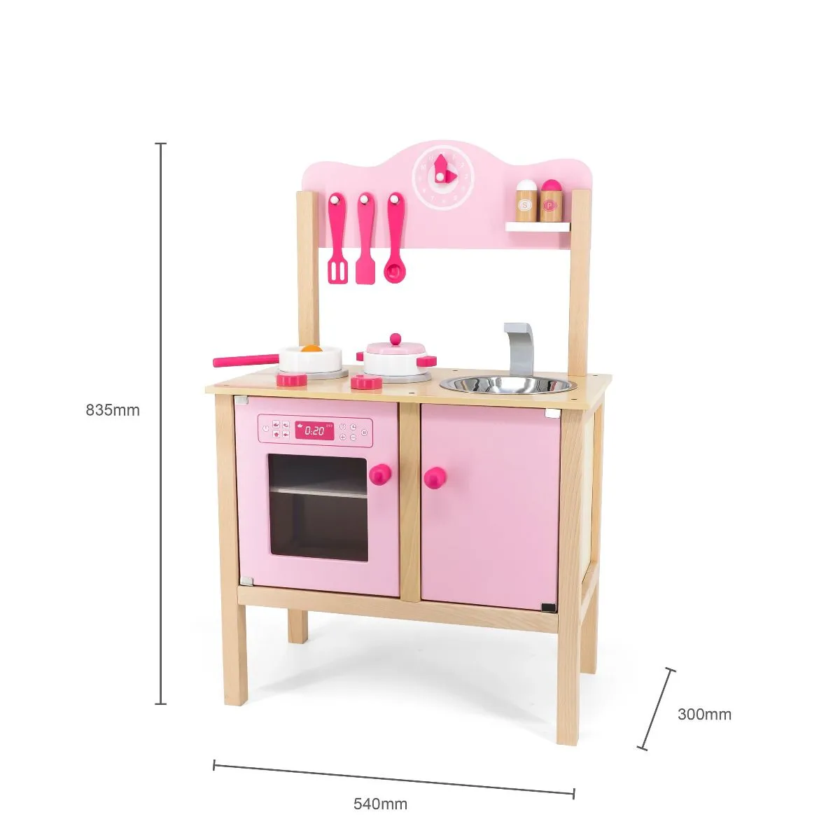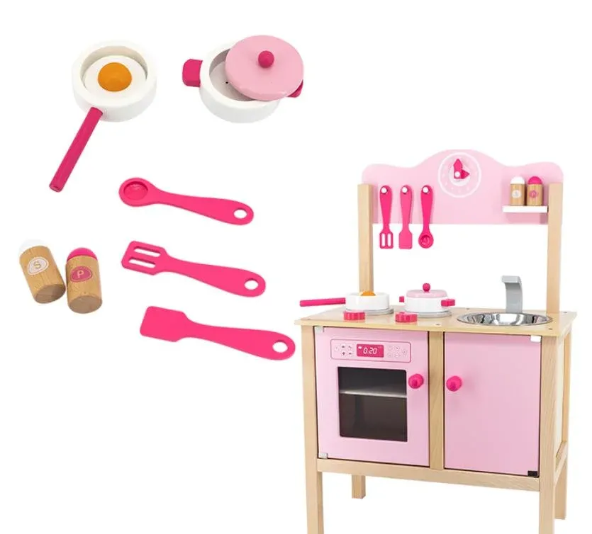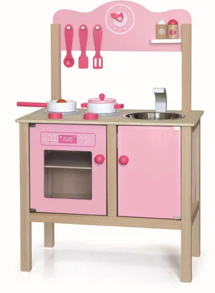 Эта красивая игровая кухня состоит из плиты с 2-мя конфорками и духовкой, столешница с раковиной, кран и шкаф для хранения, обочина с набором из 3-х ложек, набор для перца и соли и часы.
