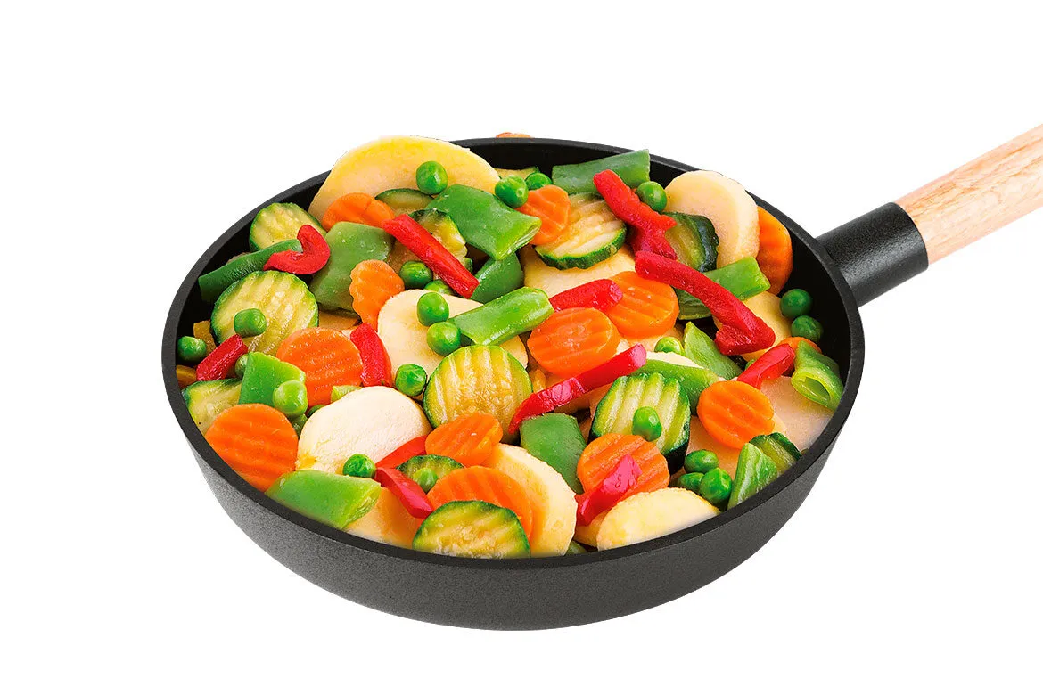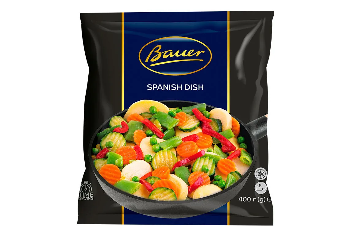 Состав: обжаренный картофель 55 % (картофель 96 %, подсолнечное масло), овощи в разных пропорциях 45 % (перец, плоскоплодная фасоль, морковь, цукини, зеленый горошек) Продукт может содержать сельдерей.