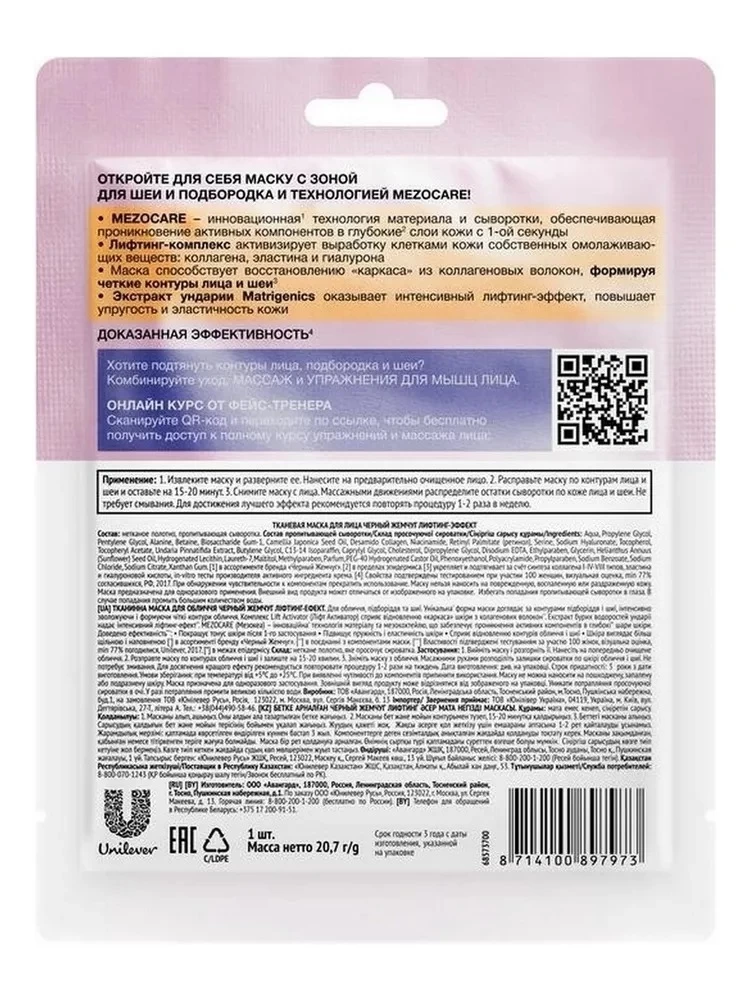 Тканевая маска для лица Лифтинг-эффект бренда Черный Жемчуг – это первая тканевая маска MEZOCARE с технологией материала с системой доставки активных мезокомпонентов в глубокие слои кожи, созданная специально для подтягивания и укрепления контуров лица и шеи – восстановления положения молодости Y-зоны. Что такое Y-зона? Не только морщины являются признаком возрастных изменений. Потеря упругости, размытый контур овала лица и состояние шеи способны добавить несколько лет. Четкие контуры молодого лица и шеи фиксируются в правильное положение Y, но со временем и под действием гравитации Y-зона переворачивается, занимая неправильное положение, происходит обвисание тканей, появляется усталое выражение лица. Тканевая маска Y-зона Лифтинг-эффект способствует восстановлению контуров лица и шеи, а также увлажняет и питает кожу с первой секунды. В составе сыворотки, пропитывающей маску, содержится эффективный LiftActivator, который способствует восстановлению каркаса из коллагеновых волокон в Y-зоне, формируя четкие контуры лица и шеи. А экстракт ундарии Matrigenics оказывает интенсивный лифтинг-эффект, повышая упругость и эластичность кожи. Для максимально направленного воздействия на область лица и шеи маска имеет форму, которая плотно облегает лицо и шею, включая зону подбородка и нижней челюсти. Благодаря особой форме маски сыворотка напитывает не только лицо, но и область шеи. Как результат, кожа лица выглядит более плотной и наполненной, контуры лица и шеи восстановлены, линия подбородка более подтянута.