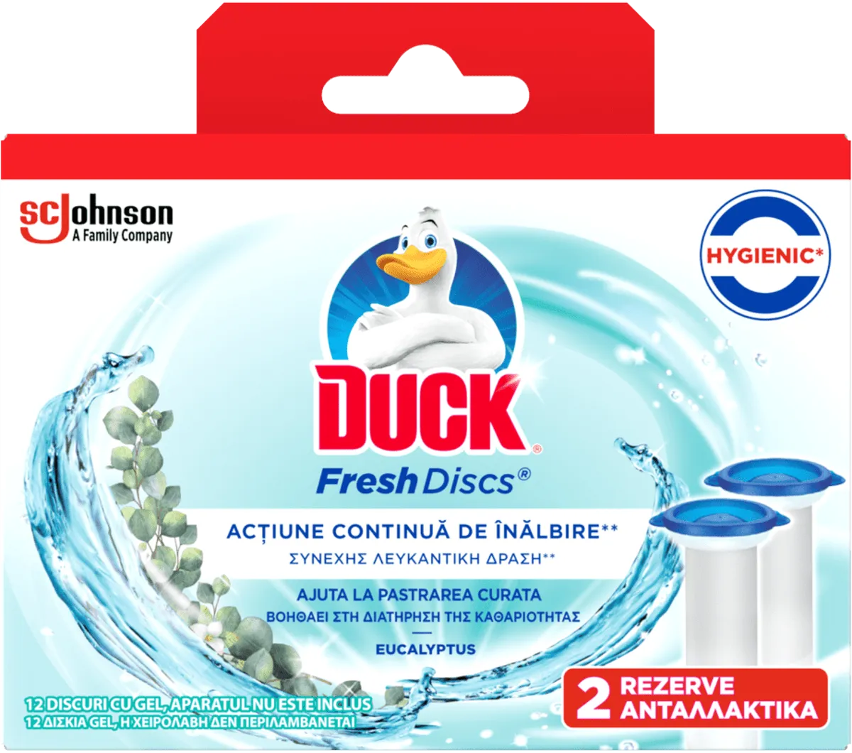 Диски Duck Fresh Discs Эвкалипт Лаванда - это лимитированная серия дисков Fresh Discs, которые освежают с каждым смывом. Уникальная гелевая технология позволяет им подниматься над чашей, обеспечивая покрытие на 360°, и работать до 630 смывов. Они помогают предотвратить появление пятен, в которых размножаются микробы и неприятные запахи. Уникальная формула Duck Fresh Discs создает вокруг чаши защитный экран, активизируемый смывом. Легко использовать! Воспользуйтесь пластиковым тюбиком с ручкой и нанесите гель на унитаз.