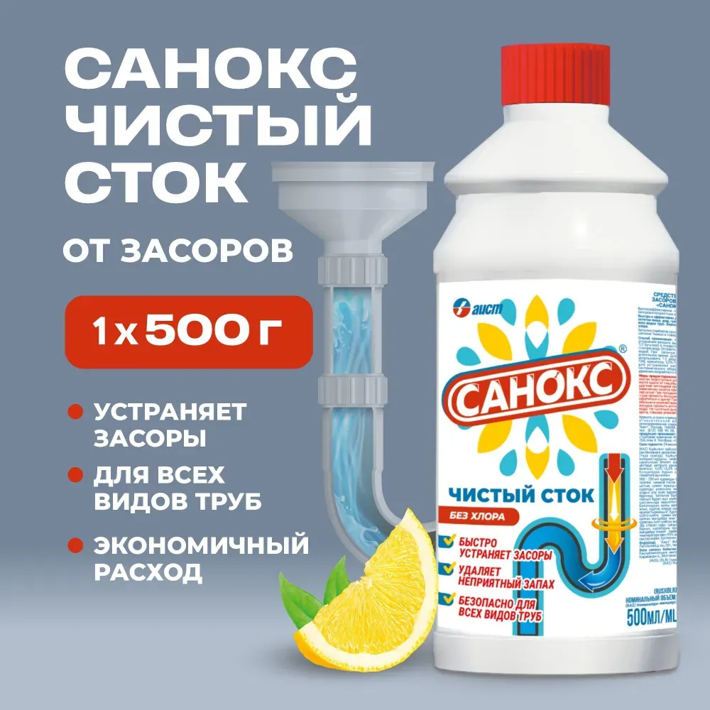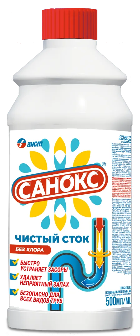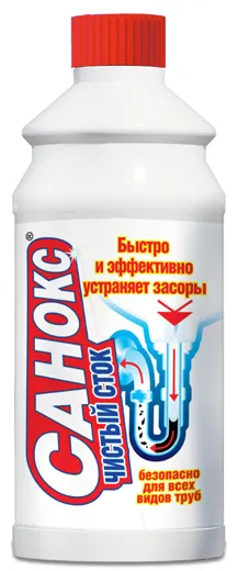 Чистящее средство для прочистки труб и устранения сложных засоров Санокс Чистый сток. Высокоэффективное гелеобразное средство для устранения засоров и неприятных запахов в сливных стоках и канализационных трубах.