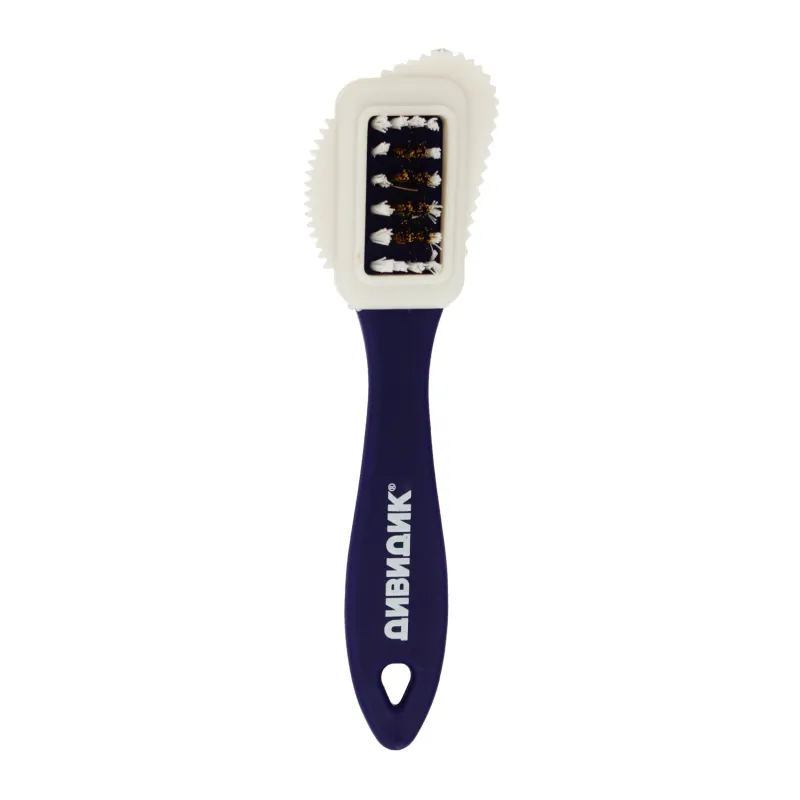 Тройная щетка для замши и нубука Дивидик устраняет пыль и загрязнения, не повреждая поверхности, бережно расчесывает ворс замшевой кожи, восстанавливая первоначальный вид изделия.