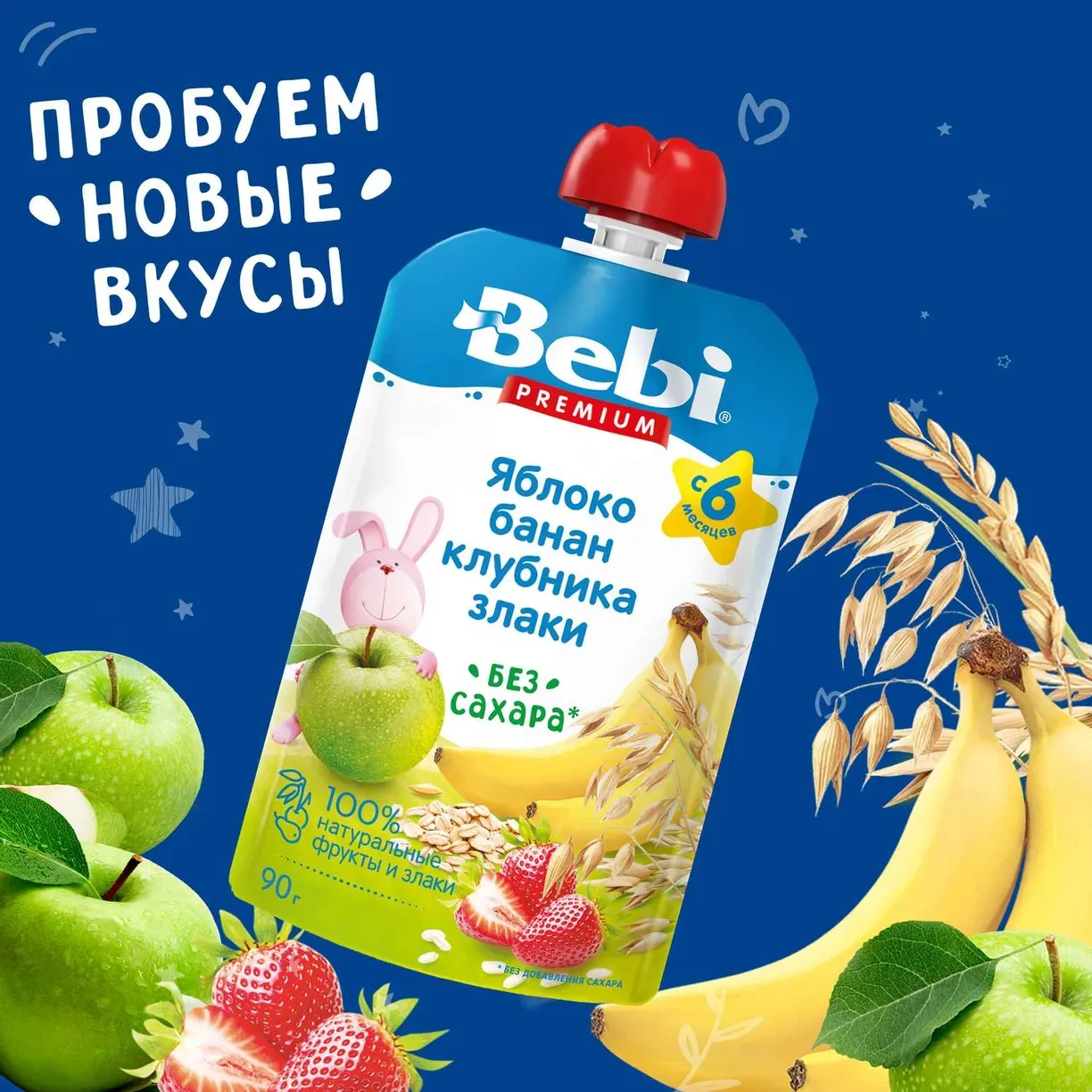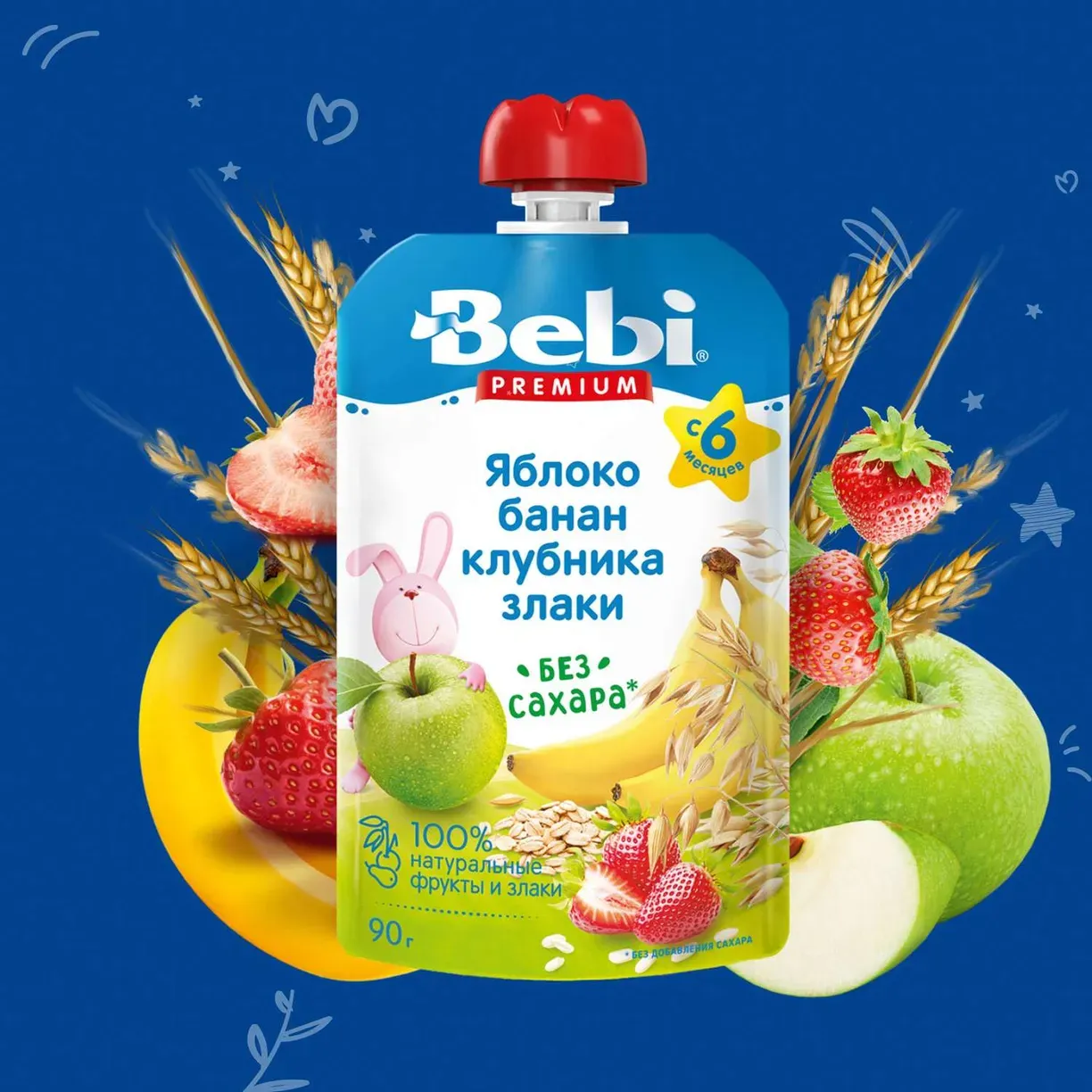 Пюре Bebi Premium яблоко-банан-клубника-злаки 90г с 6 месяцев