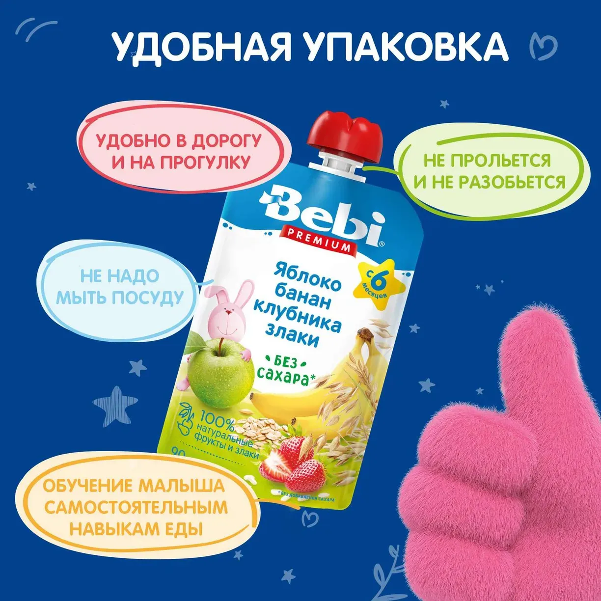Удобная упаковка – на прогулку, в дорогу, не прольется и не разобьется, не надо мыть посуду