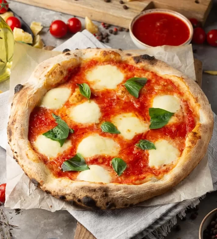 Состав: закваска (мука из твердых сортов пшеницы с/с, йодированная морская соль, оливковое масло, пекарские дрожжи, разрыхлитель: пшеничная мука, эмульгатор соевый лецитин, антиокислитель аскорбиновая кислота, альфа-амилаза), сыр моцарелла (пастеризованное коровье молоко, пищевая соль, подкислитель лимонная кислота, сычужный фермент), томатный соус (мякоть томатов, оливковое масло экстра вирджин, соль), молочный продукт (пастеризованное коровье молоко, пищевая соль, затвердитель хлорид кальция, бактериальный сычужный фермент, растительный жир), пшеничная мука, свежий базилик.