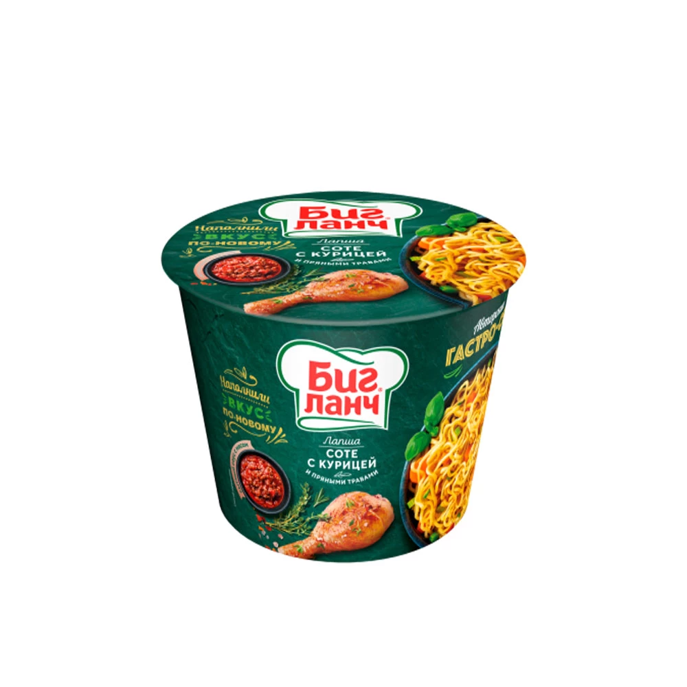 Наслаждайтесь вкусным и сытным обедом с лапшой Big Lunch, приготовленной с ароматным куриным соте и натуральными травами. Удобный стакан, насыщенный вкус и быстрое приготовление делают этот продукт идеальным выбором для перекуса дома, на работе или в дороге.