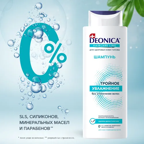 Шампунь и бальзам DEONICA Тройное увлажнение на основе мощных увлажнителей гиалуроновой кислоты, пантенола и натурального бетаина направлена на восстановление оптимального уровня гидратации волос и возвращения им здорового сияющего вида. Деликатно очищает, благодаря мягкой формуле.