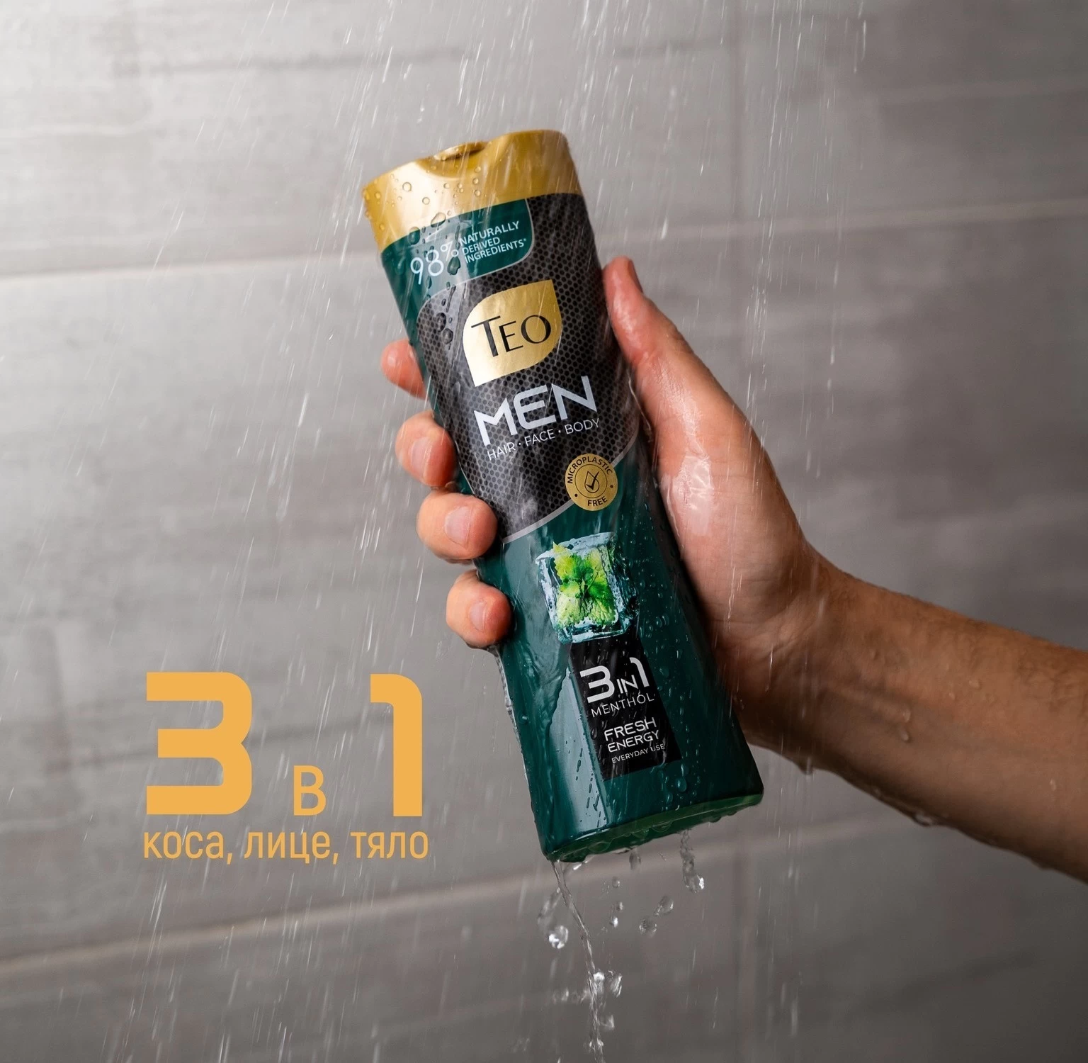 Teo Men 3в1 Ментол – Гель для душа 3 в 1 для мужчин: волосы, лицо и тело, с охлаждающим эффектом ментола