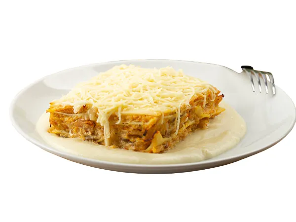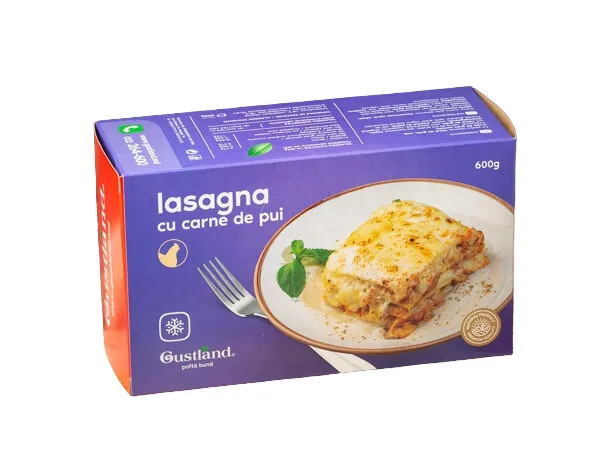 листы для лазаньи: пшеничная мука, яйца, пшеничная крупа semola; соус: молоко, сливочное масло, пшеничная мука, пищевая соль, мускатный орех; начинка: мясо цыплят бройлера , грибы, лук, морковь, стебель сельдерея, подсолнечное масло, сорбиновая кислота, черный перец; сыр твердый, сыр GP Duro italia