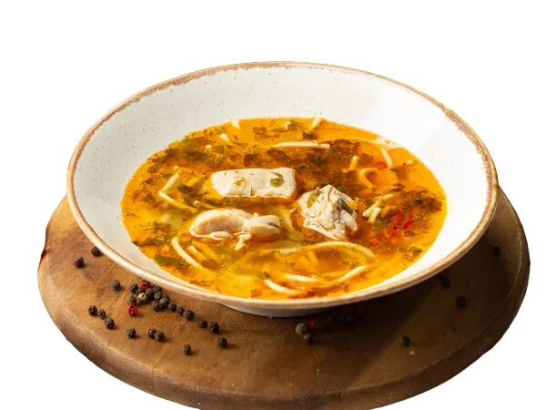 Бульон куриный, мясо куриное, лапша домашняя, морковь, перец сладкий, корень сельдерея, масло подсолнечное, зелень петрушки, укропа, лук-порей, сок лимонный, соль поваренная пищевая