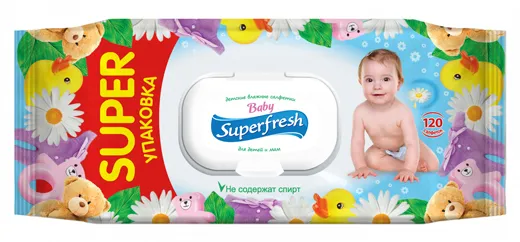 Мягкая и прочная текстура салфеток Superfresh обеспечивает нежный уход за чувствительной кожей.