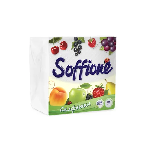Бумажные салфетки Soffione — классические однослойные салфетки, производимые из 100% целлюлозы. Изделие отличается прочностью и мягкостью.
