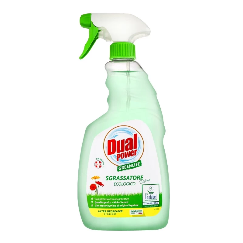 Универсальное средство для удаления жира Dual Power Green Life удаляет стойкую грязь со всех моющихся поверхностей. Его формула, основана на использовании поверхностно-активных веществ природного происхождения, обеспечивает высокую эффективность. Идеально подходит для общего очищения всего вашего дома. Не использовать на неанодированном алюминии, натуральном дереве и прозрачных пластиковых материалах (душевые кабины и т. д.). Способ применения: Распылить средство на поверхность и оставить действовать максимума на 5 мин. Равномерно распределить по очищаемой поверхности. Тщательно смыть. Для плит: нанести средство на теплую духовку (50-60 °C) оставить на 5-10 минут. Для тканей: распылить на пятно, оставить на несколько минут, затем постирать. Не оставлять средство высыхать на тканях.
