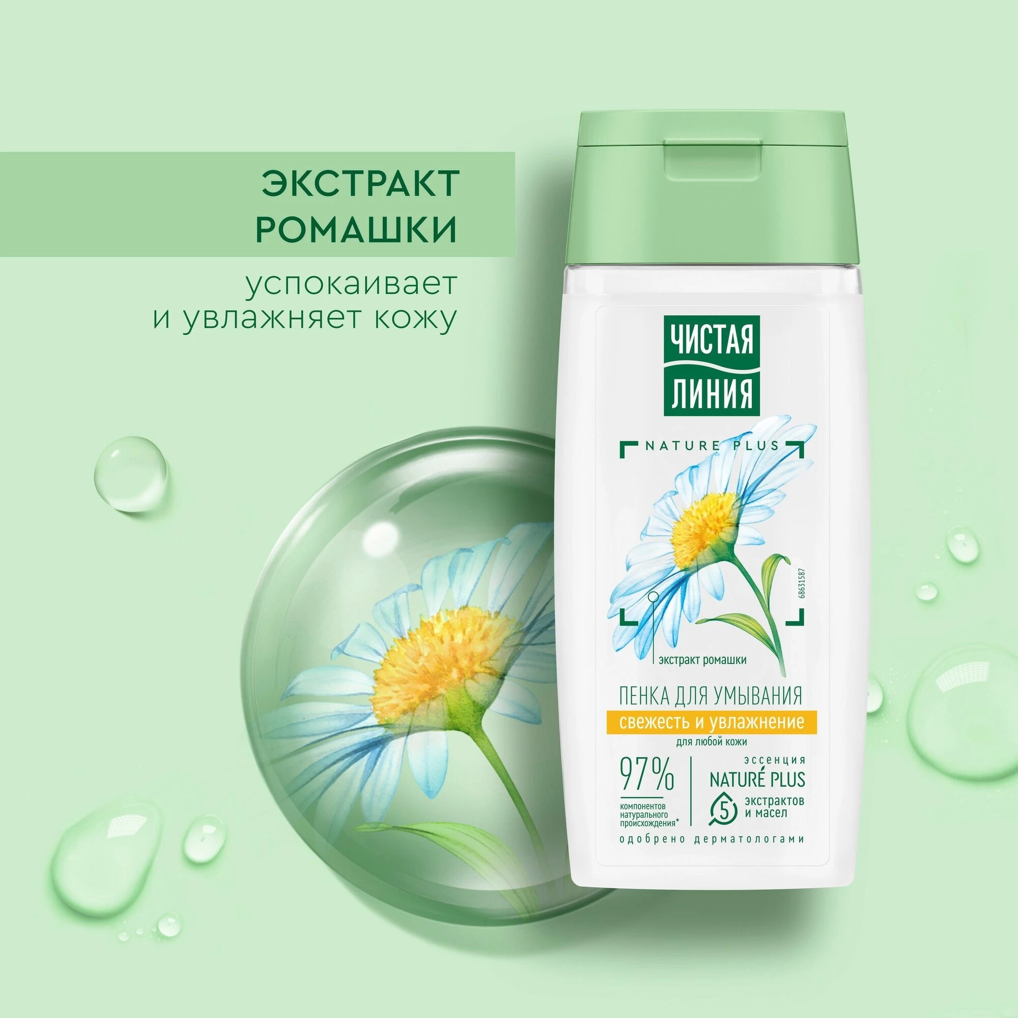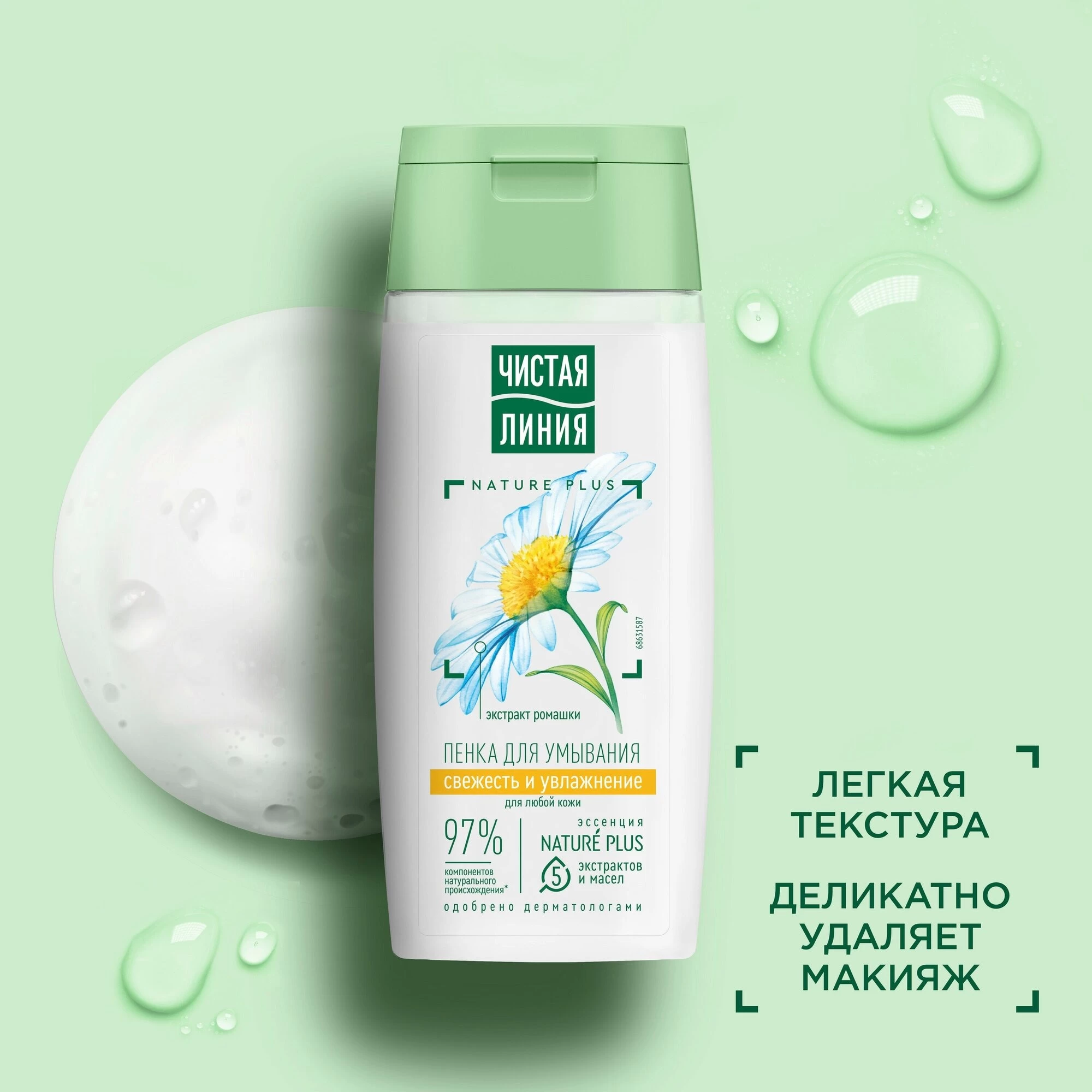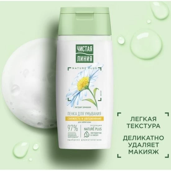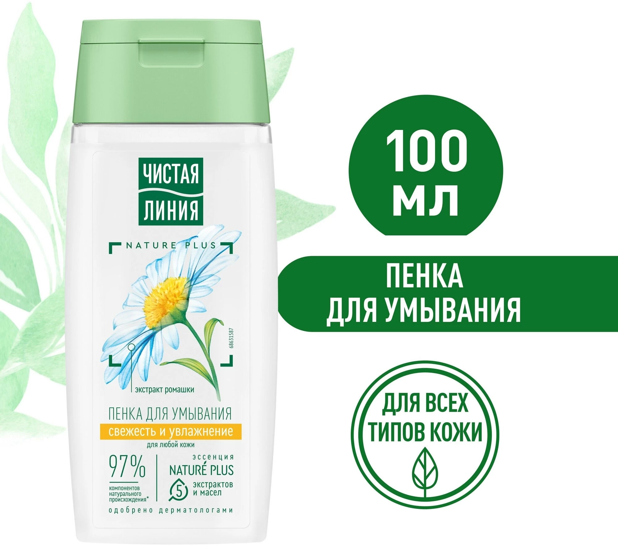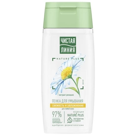 В процессе очищения кожа нуждается также и в уходе. Попробуйте пенку для умывания, разработанную экспертами бренда Чистая Линия, которая качественно очищает без сухости, придает свежесть и сияние, увлажняет кожу. Продукт содержит 97% компонентов натурального происхождения*. Активные ингредиенты: эссенция из пяти экстрактов и масел NATURE PLUS (экстракты вербены и пиона, масла миндаля, льна, оливы) и экстракт ромашки.