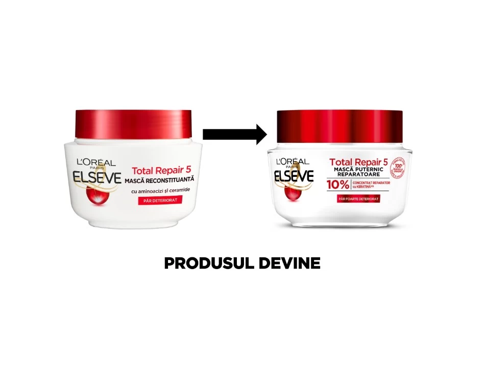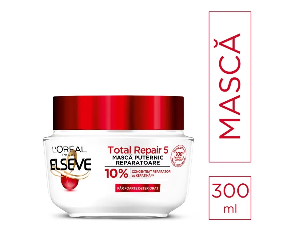 Восстанавливающая маска Total Repair 5 для поврежденных волос теперь содержит формулу, обогащенную 10% восстанавливающим концентратом KERATIN, После одного применения восстанавливается 51% волосяного волокна!* После 5 применений 100% волосяного волокна возвращается к своему естественному состоянию!* * *Инструментальные тесты - поверхностные повреждения - после 5 применений [шампунь + сильная восстанавливающая маска].