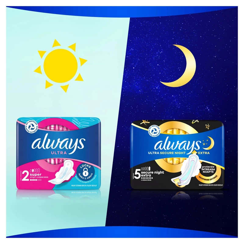 Cu Always Ultra puteți să vă simțiți încrezătoare toată ziua. Cea mai bună protecție de la Always – nu acceptați mai puțin. Formula este dermatologic aprobată de Alianța pentru Sănătatea Pielii (Skin Health Alliance). Încercați Always Ultra Secure Night cu aripioare – cele mai bune absorbante igienice Always pentru protecție pe timpul nopții.