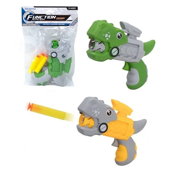 Setul include o armă în formă de dinozaur, 3 gloanțe moi.