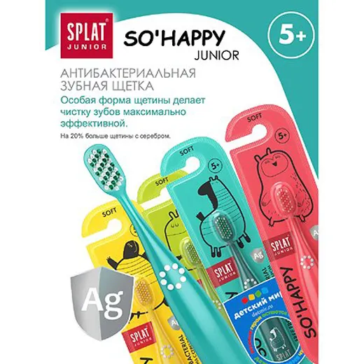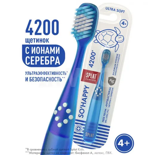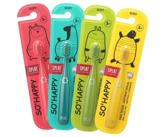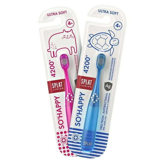 Splat Junior Ultra Soft Ultra Soft 4+ So'happy periuță de dinți inovatoare sănătoasă și eficientă pentru copii începând cu vârsta de 4 ani cu ioni de argint Caracteristici: Perii antibacterieni și igienă maximă Ionii de argint împiedică în proporție de 99% înmulțirea bacteriilor în perii Perii nu ating suprafața atunci când periuța de dinți este așezată pe o parte 4200 de peri ultra-subțiri pentru o curățare mai bună 4200 de peri curăță eficient și delicat zonele dinților, acolo unde cariile tind să se formeze rotunjirea safirică inovatoare a vârfurilor ultra-subțiri ale periilor (0,102 mm) curăță delicat dinții și masează gingiile Câmpul de culori foarte vizibil pentru distribuirea pastei de dinți Materiale absolut sigure Nu conține Bisfenol A, latex, PVC Mâner fabricat din plastic de înaltă calitate, complet sigur pentru copii (conform GREENGUARD)