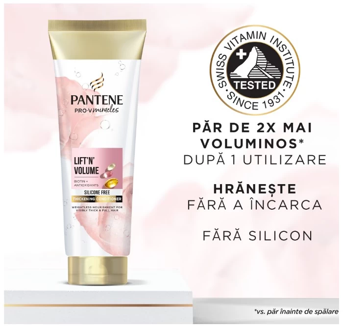 Descopera balsamul de par Pantene Pro-V Miracles Lift & Volume cu o formula imbogatita cu biotina, antioxidanti si cea mai mare concentratie de Pro-V fata de samponul Pantene Repair & Protect, ce ajuta la fortificarea (rezistenta la produsele de coafat) parului subtire si fara vlaga, lasandu-l vizibil mai gros si mai plin de la prima utilizare.
